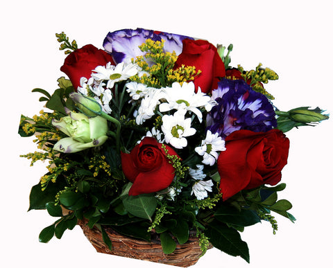 日式的藤籃子色彩鮮艷的花朵, 有紅色的玫瑰花, 白色的小菊, 金黃色的小黃鶯, 和紫色的洋桔梗。漫步田園的醉人浪漫, 讓你回憶起一段美好的時光。