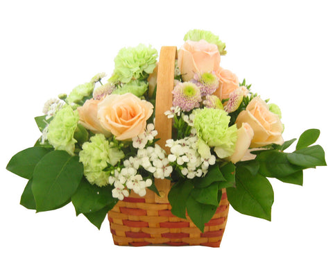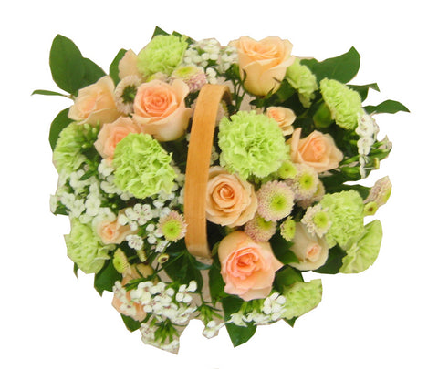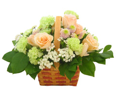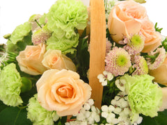 香檳色玫瑰及青檸色的康乃馨,展示夏日清新的田園色彩,伴以蝴蝶般的美女櫻,並帶小菊及襯葉。直徑大約三十厘米, 可以加入水份使花泥保持濕潤。