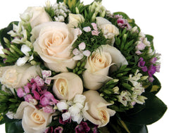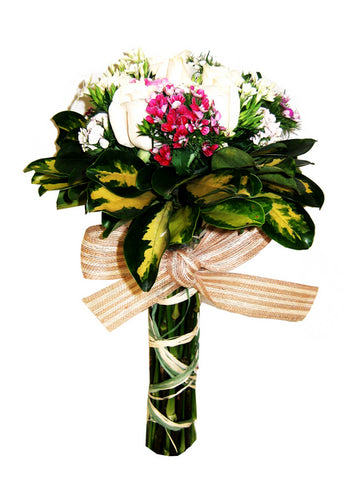 由十二枝潔白初開的白玫瑰花,伴以小花組成圓形花束。在綠葉襯托之下,再配絲帶手柄,感覺自然可愛。
