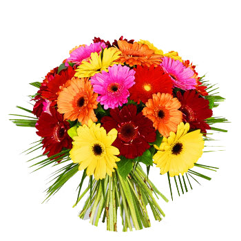 三十枝彩虹太陽菊花束,以日式包裝,伴以襯葉。生動活潑的彩色太陽菊, 是給予她無限的鼓勵和支持!