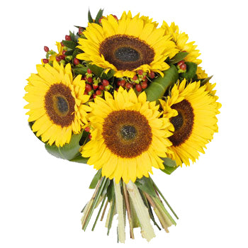 五枝太陽般的向日葵,伴以紅豆花及綠葉,代表您對情人忠誠,令她感覺到與別不同的安全感。