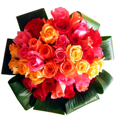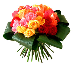 四十枝彩紅玫瑰花束,包括不同顔色的玫瑰花, 伴以綠葉圍邊及以法式手束方法,日式包裝。